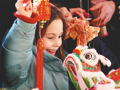 2023年1月22日,英国伦敦特拉法加广场举行春节庆典。图为一名女孩在现场购买提线狮子(资料照片)。新华社记者 李颖 摄