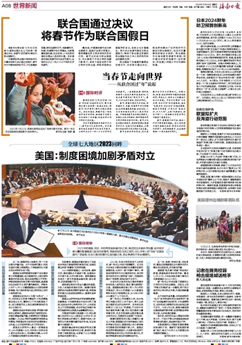 据新华社联合国12月22日电 第78届联合国大会22日协商一致通过决议,将春节(农历新年)确定为联合国假日。中国常驻联合国代表团临时代办戴兵在联大决议通过后表示,春节作为中国传统民俗节日,不仅是阖家团圆、辞旧迎新的日子,传承着和平、和睦、和谐等中华文明理念,也承载着家庭和睦、社会包容、人与自然和谐共生等全人类共同价值。许多国家和地区把春节作为法定节假日,全球约五分之一的人口以不同形式庆祝春节。