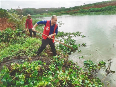 海口市烟草专卖局驻村工作队员在帮扶村美城村清理河淤。