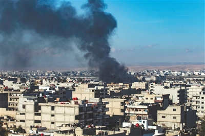12月25日,叙利亚东北部城镇卡米什利由于土耳其军队空袭升起浓烟。