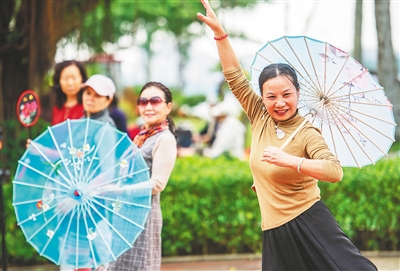 12月27日,气温有所回暖,不少琼海市民纷纷走出家门沐浴阳光,在万泉河公园参与走秀、跳舞等各类文娱活动。