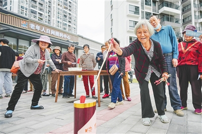 12月27日,在三亚月川社区老年人日间照料中心,老人排队参与投壶游戏。