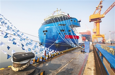 图为28日拍摄的国产万吨级电动集装箱船“中远海运绿水01”。新华社发