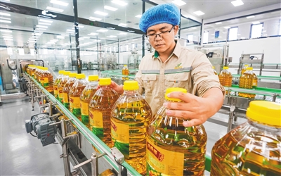 海南澳斯卡国际粮油加工项目生产线上,工人对成品油进行包装。本报记者 陈元才 摄
