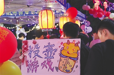 在游戏区,游戏的设计充分结合了学院的特色和浓厚的节日氛围,套鸭子、猜灯谜、蒙眼敲锣等传统游戏依然大受参与者青睐;化学与化工学院的“你能抓住氢原子吗?”“可逆反应”让师生在游戏的同时感受到学科的魅力;美术学院的“大漆工艺之艺术之旅”“画龙点睛”将传统文化与美术相结合,让同学们在游戏中接受了艺术的熏陶……各个社团的同学们载歌载舞,扮演动漫角色,充满了青春的活力。