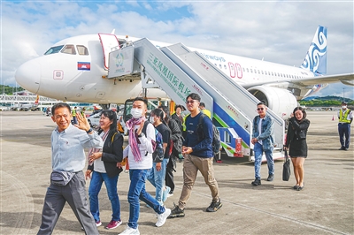 12月1日上午9时许,自柬埔寨金边起飞,由柬埔寨航空有限公司(Cambodia Airways)执飞的KR9755航班飞抵三亚凤凰国际机场。图为来自柬埔寨金边的旅客走下客机。