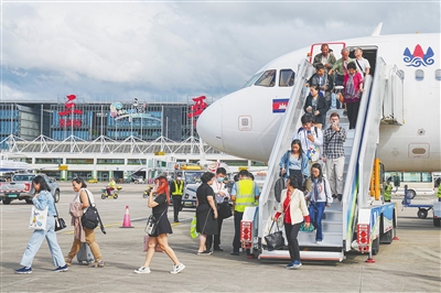 在海南控股等多方努力下,自柬埔寨金边起飞的KR9755航班飞抵三亚凤凰国际机场,标志着海南首条第五航权国际客运航线开通。(资料图)