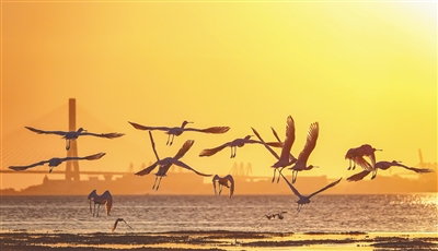 海南儋州湾,一群黑脸琵鹭展翅飞翔。 陈元才 摄