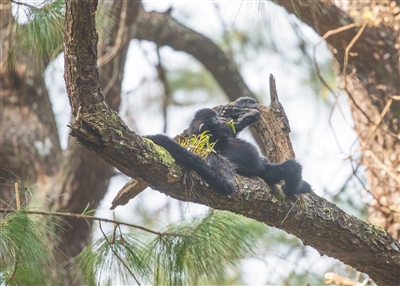 海南热带雨林国家公园霸王岭片区,海南长臂猿躺在松树上采食石斛。 李天平 摄