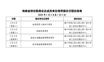 根据安排,2024年1月2日至5日,省退役军人事务厅、省国资委、省地方金融监督管理局、省市场监督管理局相关负责人将分别于海南省海口市美兰区大英山西二街4号“海南省人民来访服务中心”接访群众。