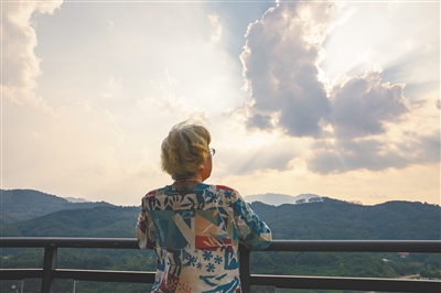 在五指山市仁帝山康养基地,“候鸟”老人在阳台欣赏风景。