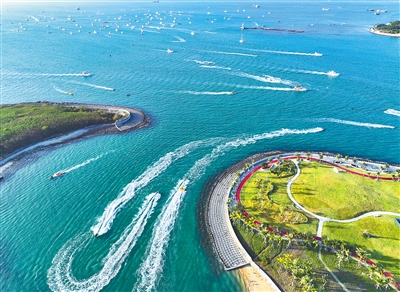 1月1日,大量游艇、摩托艇驰骋在三亚湾海面上。元旦假期,许多市民游客都选择用时尚的水上活动感受海洋魅力,欢度佳节。本报记者 王程龙 摄