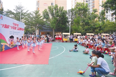 屯城镇吉安小区,民居围观演出。屯昌县委宣传部、县文明办深入社区举办“瓦爱瓦室”公益便民集市活动,为民众提供健康义诊、儿童关爱、文娱演出、问题咨询、政策解读等服务。