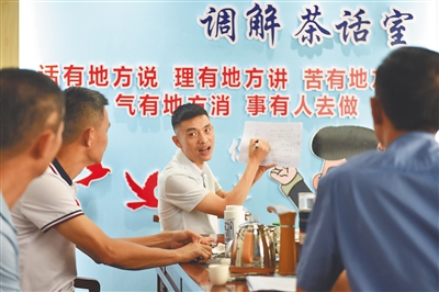 屯城镇城北社区调解茶话室,干部在做居民思想工作。近来,屯昌在农村、社区打造调解茶话室、板凳调解室等,由干部、法律专业人士对民众矛盾纠纷进行调解,让大家“话有地方说,理有地方讲,苦有地方诉,气有地方消,事有人去做”。