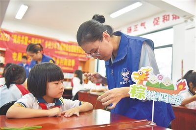 乌坡镇白毛坡村,“小屯妹”志愿者教授小学生缝制香囊。屯昌积极引导干部及各领域人士担当“小屯妹”“大昌叔”志愿者,提供小学生、孕妇等群体关爱、基层矛盾纠纷化解等服务。