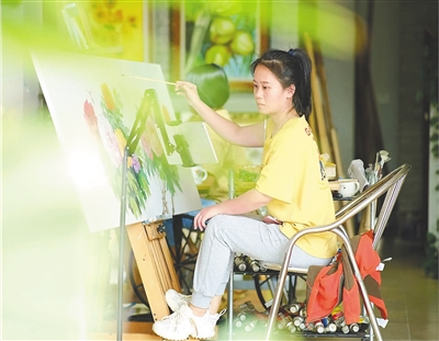 屯昌县城油画一条街一间工作室里,画师进行油画创作。屯昌民间油画传统深厚,在油画一条街,当地给予各工作室租金优惠,以及技术培训、品牌推广等支持,助力其油画产品销售海内外。