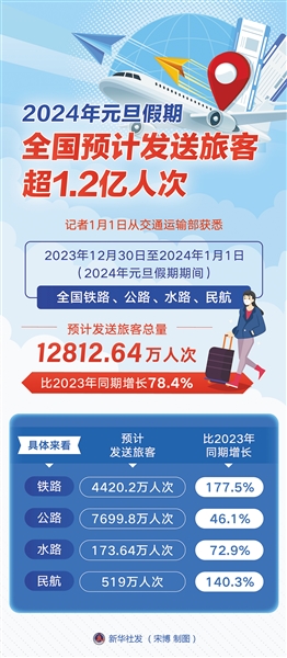 旅游通达,出行顺畅。来自交通运输部的数据显示,元旦假期期间,全国铁路、公路、水路、民航预计发送旅客总量超1.2亿人次,比2023年同期增长78.4%,比2022年同期增长33.1%。