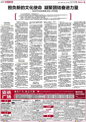 将学习宣传贯彻习近平文化思想,置于全方位、系统性宣传阐释习近平新时代中国特色社会主义思想的大格局中,2023年宣传思想文化战线不断推动党的创新理论深入人心、落地生根。