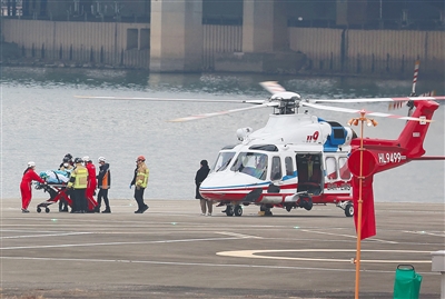 1月2日,在韩国首尔,转运李在明的直升机降落后,工作人员将其抬下。新华社/法新