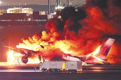 图为1月2日在日本东京羽田国际机场拍摄的起火客机。新华社/法新