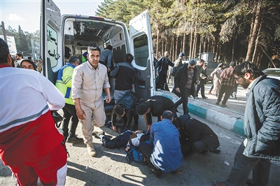 1月3日,在伊朗克尔曼市,医护人员在爆炸事故现场附近抢救伤员。新华社/美联