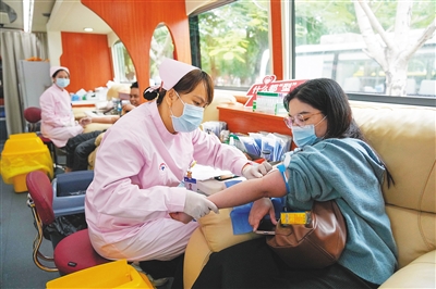 1月4日,2024年海南省无偿献血宣传月活动在海口市万绿园启动。图为爱心市民正在献血。本报记者 李天平 实习生 彭佳珲 摄