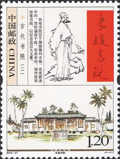 中国古人讲求诗礼传家,在千百年历史流转中,承载着思潮与文明的书院应运而生。2009年11月15日,全套4枚的2009-27《古代书院(二)》特种邮票发行,位于儋州市中和镇的东坡书院登上邮票,铭刻下苏轼在海南传经授业,赓续文化的场所。