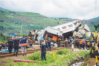 1月5日,在印度尼西亚西爪哇省,工作人员在列车相撞事故现场工作。