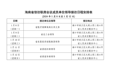 根据日程安排,1月8日至12日,省医疗保障局、省总工会、省农垦投资控股集团、省委组织部、省委宣传部相关负责人将分别于海南省海口市美兰区大英山西二街4号“海南省人民来访服务中心”接访群众。