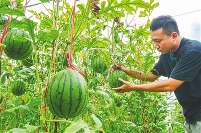 2023年12月6日,在三亚崖州区长山村西甜瓜种植基地,工作人员查看彩虹西瓜生长情况。本报记者 王程龙 摄