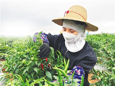 村民在王五镇峨阳智能生态农场采摘辣椒。 儋州市融媒体中心供图