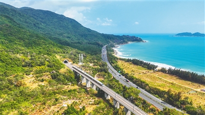 1月9日,在万宁市和陵水黎族自治县交界的牛岭隧道处,动车从环岛高铁隧道内驶出,车辆行驶在海南环岛旅游公路上。时下,海南迎来冬季旅游热潮,众多岛内外游客选择自驾或动车出行,在旅途中尽情感受海南山青海碧的优美风光,邂逅美丽迷人的“诗和远方”。