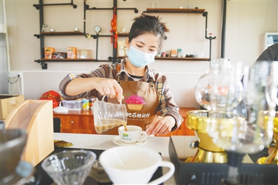 在澄迈县桥头镇沙土村的桥沙驿站,工作人员为游客冲泡地瓜拿铁。 本报记者 李天平 摄