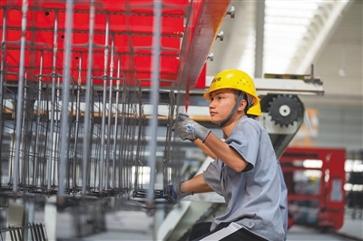 三亚智城装配式构件生产基地内,工作人员在生产线上赶制订单。本报记者 袁琛 摄