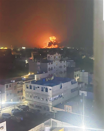 图为一月十二日在也门首都萨那拍摄的空袭后的爆炸画面。新华社发
