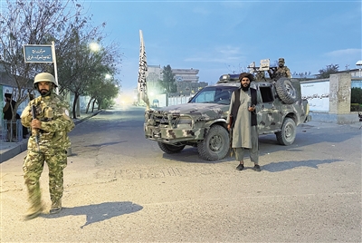 阿富汗临时政府内政部14日发布声明说,阿西南部尼姆鲁兹省省长办公楼当日遭自杀式炸弹袭击,造成3名安全人员受伤,自杀式袭击者被当场击毙。图为安全人员在阿富汗尼姆鲁兹省的自杀式炸弹袭击现场附近执勤。新华社发