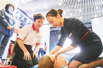 在海口友谊阳光城,员工学习救护技能实践操作。本报记者 武威 摄