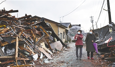 在日本石川县珠洲市,人们经过遭地震损毁的建筑。