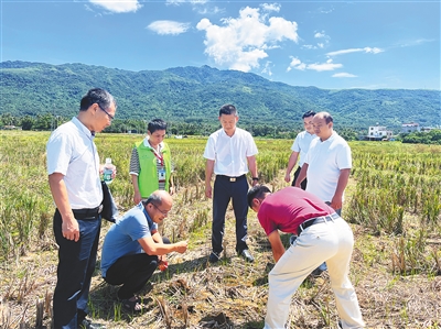 照片里,省农科院专家、光坡镇党委书记、光坡镇乡村振兴工作队队长、种植农户等7个人围在一起,他们的目光齐刷刷地往下看,眼前是布满杂草、枯杆的田地,身后是一大片刚收割完的稻田。