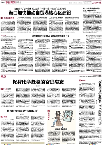 强化创新驱动,加快培育现代化产业体系。海口今年将实施科技赋能行动,完善国家技术转移海南中心功能配套,推进重大新药创制试点,推动更多引领型科技成果转移转化。实施投资增效行动,引进一批龙头企业、独角兽企业、隐形冠军企业、总部企业及产业链“链主”企业,签约投资类项目金额500亿元以上。