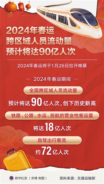 作为疫情防控转段后的第二个春运,今年出行需求大释放。根据预测,今年春运铁路、公路、水路、民航等营业性客运量将达18亿人次,与2023年相比,多2亿多人次。按一个人来回需要乘坐4次车计算,相当于多了5000万人口在流动。