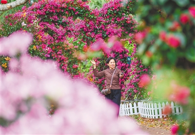 近日,海口金牛岭公园三角梅盛开,市民拍照留念。本报记者 李天平 摄