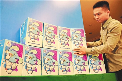 1月19日,工作人员在新闻发布会现场摆放第十二届全国少数民族传统体育运动会吉祥物。 本版图片除署名外均由 本报特派记者 王程龙 摄