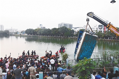 1月18日,在印度古吉拉特邦瓦多达拉,起重机将沉没的船只吊出水面。