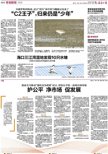 卢刚介绍,水雉是湿地生态系统指示物种,2021年被列为《国家重点保护野生动物名录》中二级保护物种。海南目前已发现的水雉种群一般仅有两三只。此次在三江湾湿地发现10只的种群十分难得。