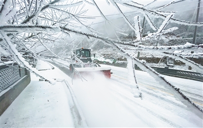 在241国道湖北省保康县后坪镇红岩寺路段,公路养护工人在进行除雪作业。新华社发