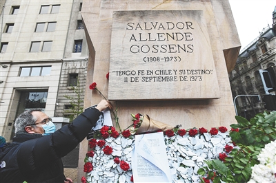 在智利首都圣地亚哥,民众在前总统阿连德雕像前献花。阿连德在政变中遇难。新华社发