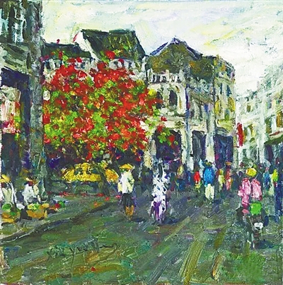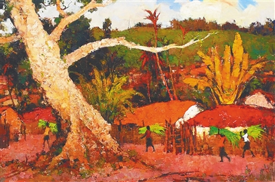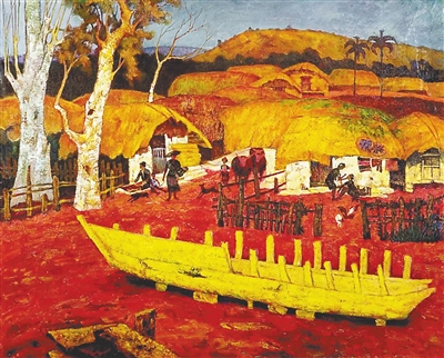 黎族苗族文化是海南宝岛一颗璀璨的明珠。黎族的织锦、烧陶等代代相传,都经过了历史的冲刷洗礼,历久弥新。王锐的油画《花开花落》,以粗犷厚重的笔触描绘了黎族人家的日常劳作景象,在朴实单纯的色彩语汇下投射出热烈奔放的意境。