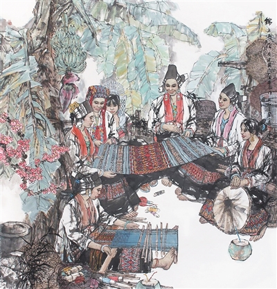 乔德龙的中国画《织锦图》、陈茂叶的版画《幸福山歌》、阮江华的中国画《收获时节》、易至群的中国画《黎乡母与子》、齐英石的中国画《锦上添花》、徐鸿才的版画《欢乐三月三》、林明俊的中国画《烟波声远》、刘小莉的中国画《琼崖尽是春》、王家儒的油画《流金岁月》《南国骄阳》、张继光的油画《寨子来客》等作品,都是从黎族苗族人民的生活中汲取养分,同时也是对黎族苗族人民生活的礼赞。