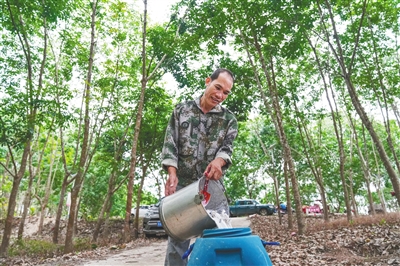 在白沙黎族自治县细水乡的橡胶林里,一位村民在收集乳胶。 本版图片均为资料图